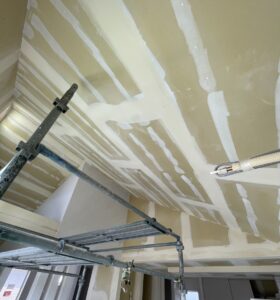 石膏ボードの継ぎ目やビスの頭をパテで埋め、平滑な面に整えていく工程です。